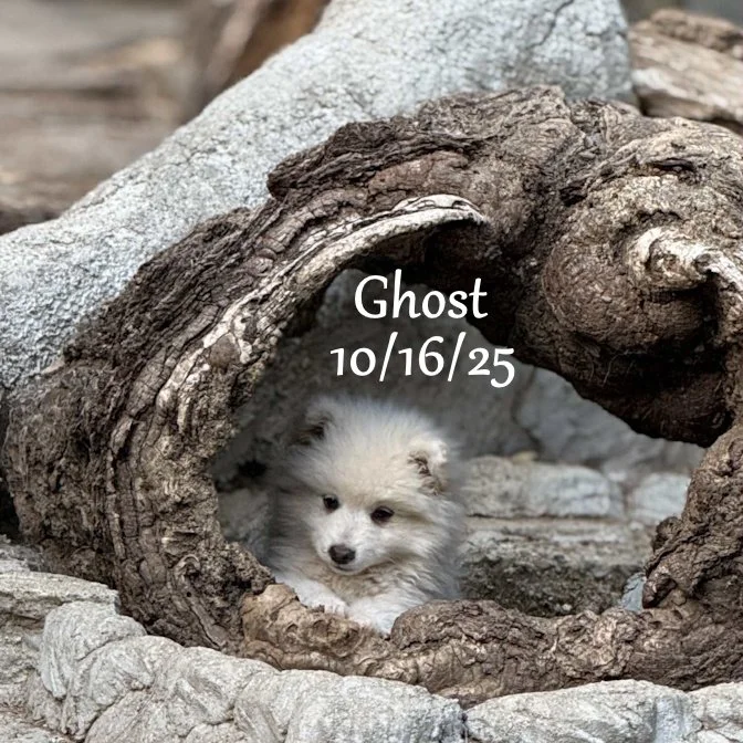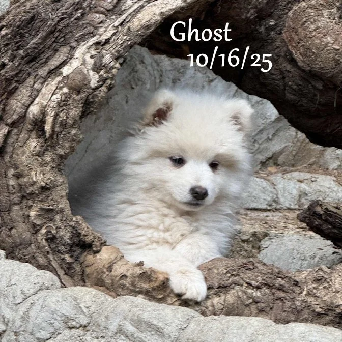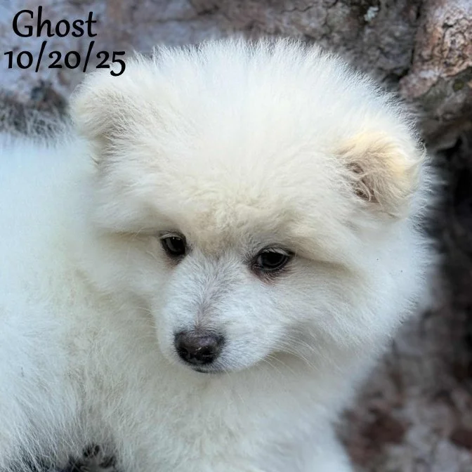 Okay… So, we can’t have TRUE “favorites” because all the babies are perfect… But Mom (Donna) has a real soft spot when it comes to these fluffy little Eskimo babies. “Ghost” a typical Eskie and has captured her heart. He was the first one to come out of his house to explore and he was the one who came out wagging his little poofy tail to say ‘hello” each morning. His price is super low because his testicles have not descended yet.